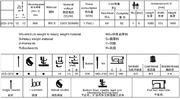 特點本機是雙星厚料機系列中的大力士,采用綜合送料方式和圓筒形縫臺,送料力量強勁穩定,能輕易車縫多層厚重物料,線跡精準美觀。采用進口大型特種擺梭,梭芯線量大,縫制效率高。梭芯繞線裝置位于機頭上部,壓腳提升時可達20毫米,可適用于縫制手提袋的手把、棒球手套、運動器材、安全袋、帳篷、座墊、馬鞍、箱包等厚料和中厚料物品。