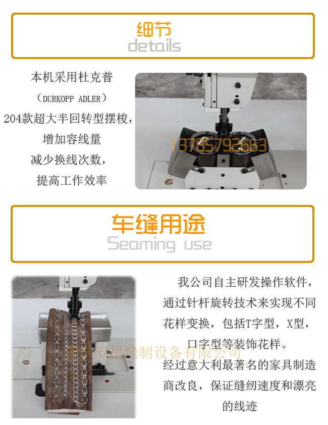 This machine is the newest equipment in the decoration line of double star coarse line.This line press adopts the comprehensive feeding mode,and the feeding force is strong and stable,The company developed the binary software,by rotating the needle bar technology to achieve different pattern transformation,including T type,can guarantee the sewing speed and beautiful stitches are X mouth shaped decorative pattern of this machine improved the most famous Italy furniture manufcturers in the coener of sofa and car seat cover for pressure line operation.This machine adopts DU kEpu(DURKOPP ADLER)204 large half back transfoemation shuttle,increase line capacity,reduce change times,improve work efficiency can use a very coarse line pattern decoration sewing equipment indispensable high-grade sofa an car manufacturers.